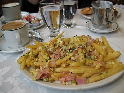 - Incorporar el jamón cocido, las papas fritas y los huevos.